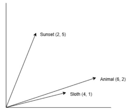 For example, by using two-dimensional embedding vectors for the words “Sunset,” “Animal,” and “Sloth,” we can plot these vectors as coordinates to visualize their relationships. Measuring the angles between “Sloth” and “Sunset” versus “Sloth” and “Animal” clearly shows that “Sloth” is more semantically aligned to “Animal,” as their vectors point in a similar direction. This enables software to return a photo of a sloth, even if the user searched for “animal.”